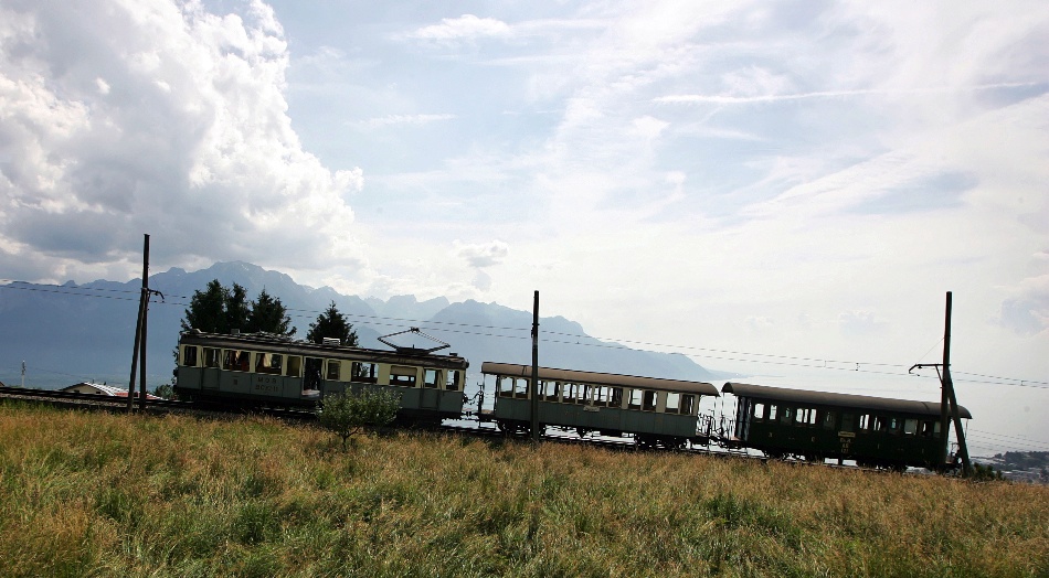 Rame historique du MOB, Musée de Blonay Chamby. Les Alpes de Savoie et le lac Léman, en fond.